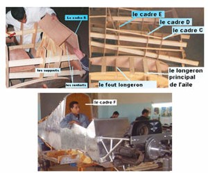 La dernière journée de présentation soit le 26 décembre 2006, Mr Hocine Bentrad, un des maîtres assistants à l'IAB, a insisté pour me montrer un projet de trois étudiants de l'IAB. Une fois dans les locaux du département de structure, ma surprise était grande. Un modèle d'avion léger dénudé de son revêtement des ailes apparaît. À côté de ce modèle, il y avait deux techniciens supérieurs (TS) Adel et Hamoud (Figure 1). Le troisième, Hichem, était absent ce jour là. Il y avait aussi Melle Ghania Alili en 2ème année TS propulsion et Melle Chirine (Cherifa) Medjrab 3ème année Ing construction (Figure 2). Les deux ont contribué considérablement dans le projet.