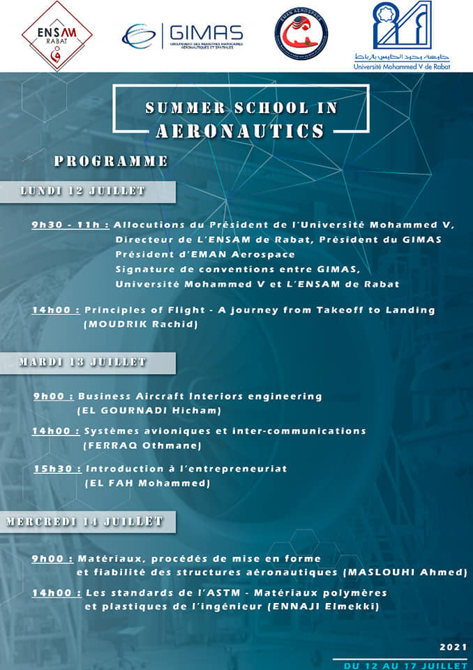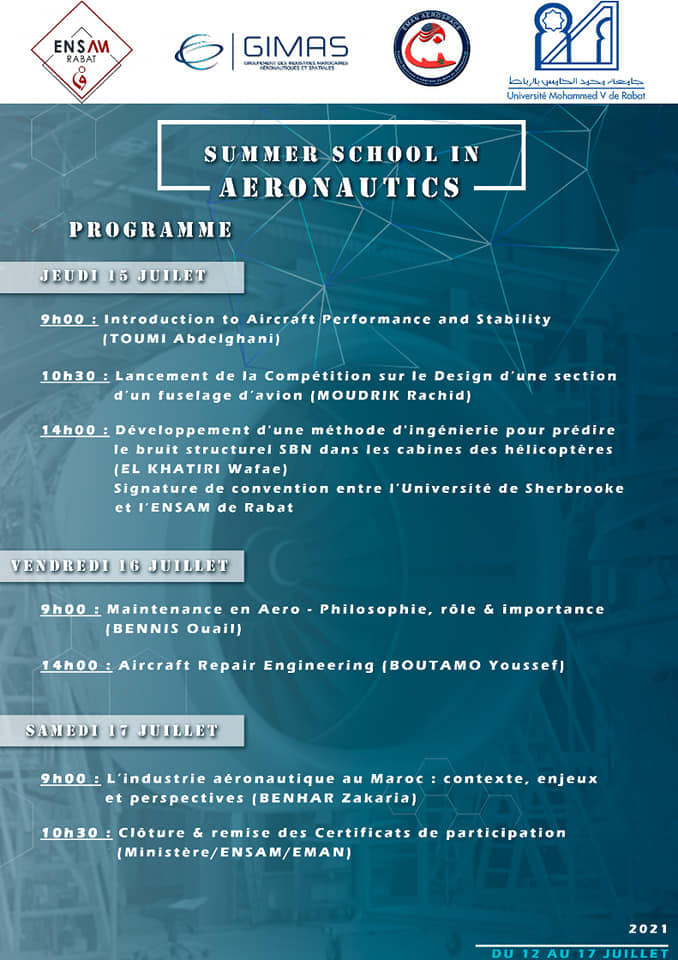 L'ENSAM (École Nationale Supérieure d'Arts et Métiers) de Rabat organise du lundi 12 juillet au samedi 17 juillet et en partenariat avec le réseau des Experts Marocains d’Amérique du Nord en Aéronautique (EMAN AEROSPACE) une université d'été en aéronautique.