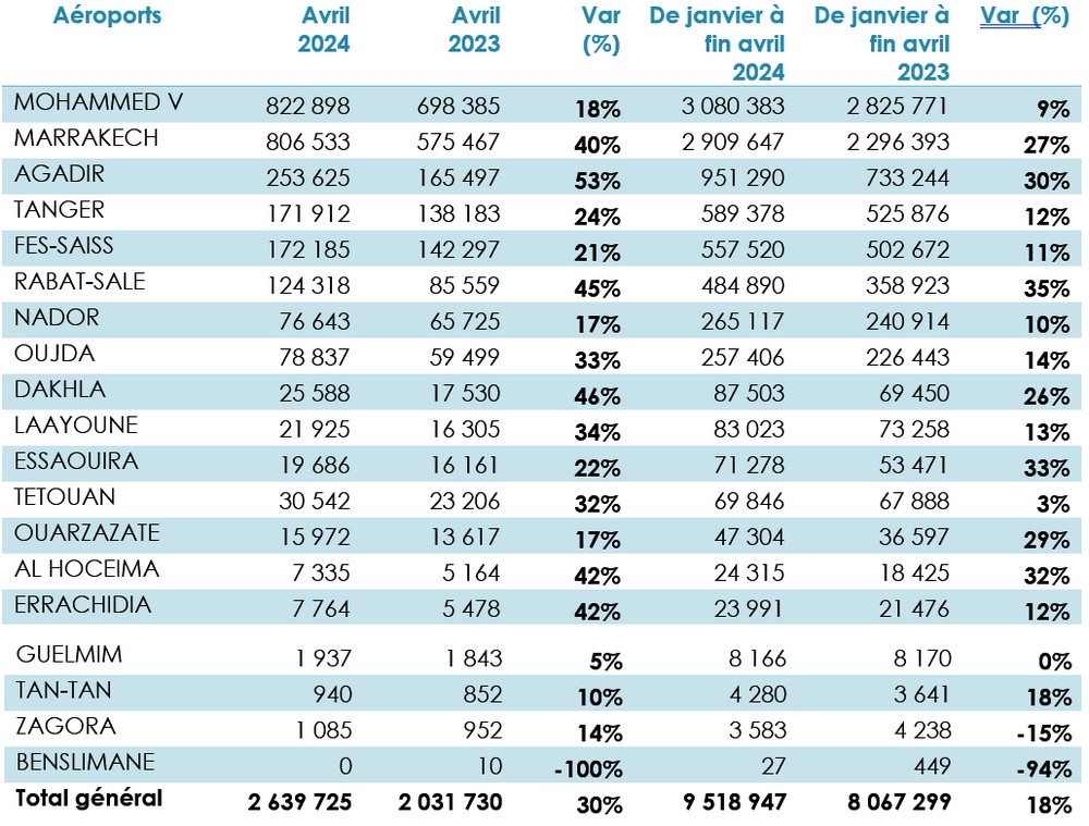▪ Les Aéroports au Maroc ont enregistré un volume de trafic commercial de 2 639 725 passagers en avril 2024. C'est une forte hausse de 30% par rapport à avril 2023.