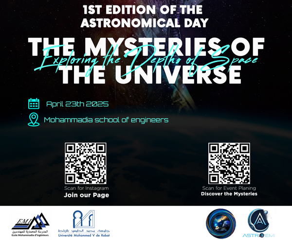 🌌 Première Journée Astronomique organisée par ASTROEMI à l'École Mohammadia d'Ingénieurs le 23 avril 2025. 🚀 Expositions, conférences, et observations exceptionnelles au programme ! 🔭