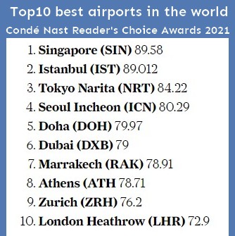 ▪ Marrakech-Ménara au 7ème rang mondial avec un score de 78,91/100 à l'occasion de la 34e édition des Readers' Choice Awards des meilleurs aéroports au monde réalisée par "Conde Nast Traveler".