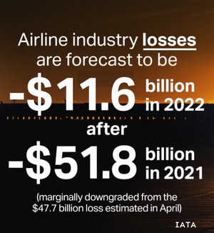 ▪ Les pertes nettes du secteur aérien devraient diminuer à 11,6 milliards de dollars en 2022 après une perte de 51,8 milliards de dollars en 2021.