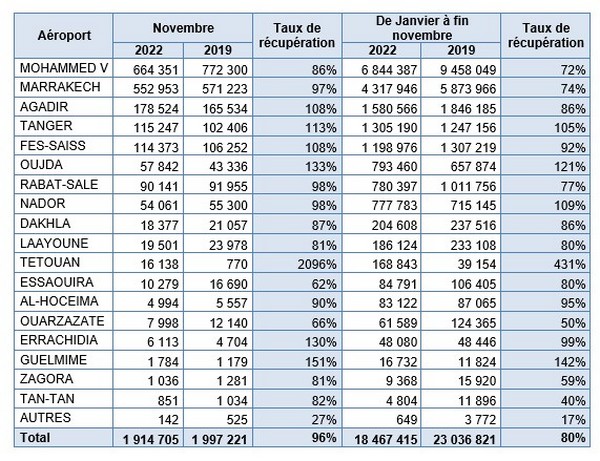 ▪ Aéroports du Maroc : Récupération en novembre de 96% des passagers par rapport au même mois de 2019.