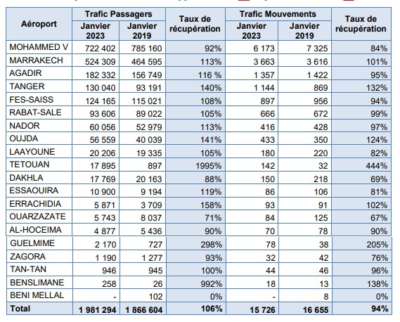 ▪ Les aéroports marocains ont enregistré, durant le mois de janvier 2023 une évolution du trafic passagers de 6 % et un taux de récupération des mouvements d’avions de 94%, par rapport à la même période de l'année 2019.