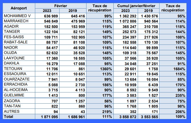 Durant le mois de février 2023, plusieurs aéroports ont enregistré des taux d’évolution à deux chiffres, par rapport au trafic enregistré durant la même période de 2019. Il s’agit des aéroports de : Tanger (49 %), Oujda (48 %), Agadir (19 %) Nador (16 %), Marrakech (15 %), et Essaouira (13 %). Parallèlement plusieurs aéroports ont enregistré des taux importants de récupération : Casablanca Mohammed V (99 %), Ouarzazate (99 %), Dakhla (95 %) et Al Hoceima (90 %).