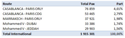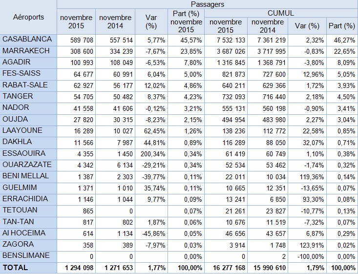 Les aéroports du Royaume ont enregistré, en novembre 2015, un volume de trafic commercial de 1 294 098 passagers, soit une augmentation de +1,77 % par rapport à la même période de l’année 2014. L’aéroport Mohammed V a enregistré 589 708 passagers (+5,77%), l’aéroport Rabat-Salé a enregistré 62 927 passagers (+12,02%) et l’aéroport Tanger Ibn Battouta a enregistré 54 705 passagers (+8,37%).