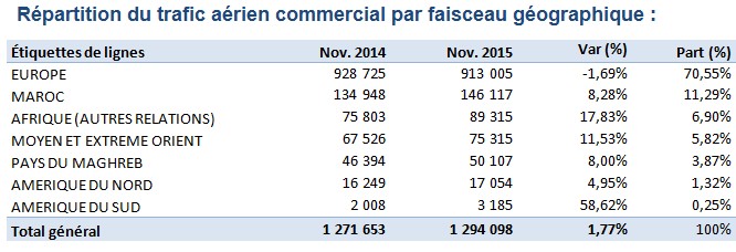 Avec 1 147 981 passagers, le trafic aérien commercial international a enregistré en novembre 2015 une augmentation de +0,99% par rapport à la même période de l’année précédente.