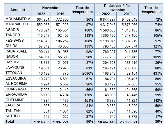 Pour le trafic aérien cumulé de janvier à fin novembre 2022, les aéroports du Maroc continuent d’afficher des taux de récupération en progression par rapport à la même période de 2019, en accueillant 80% des passagers et 82% des mouvements aéroportuaires, soient respectivement 18 467 415 passagers et 157 687 mouvements aéroportuaires pour l’ensemble des aéroports.