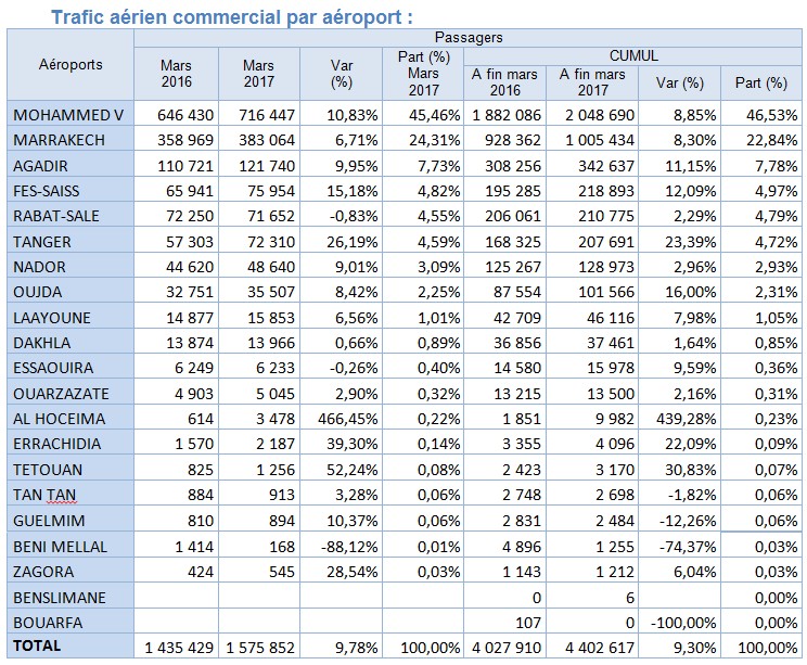 Les aéroports du Royaume ont enregistré en Mars 2017, un volume de trafic aérien de 1 575 852 passagers, soit une augmentation de (+9,78%) par rapport à la même période de l’année 2016.