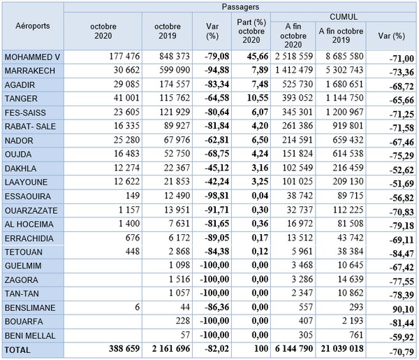 Durant le mois d’octobre 2020, il y a eu 5024 mouvements d’avions, en baisse de 71,94 % par rapport à la même période de l’année écoulée. La part de l’aéroport Mohammed V est de 48,27% de ce trafic, Marrakech Menara (8,30 %) et Agadir Al Massira (7,52 %).