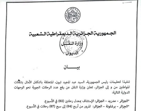 Air Algérie va reprendre sa route vers Madrid au départ de l’aéroport international d’Alger à raison de 2 vols par semaine, indique le ministère des Transports dans un communiqué. Air Algérie est également autorisée à augmenter la fréquence de ses vols sur la ligne Barcelone-Alger en passant de 4 vols à 7 vols par semaine.