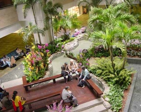 L'atmosphère de Changi est calme et feutrée, son sol étant recouvert partout d'une moquette insonorisante épaisse, aux couleurs vives. On trouve dans son enceinte, outre les nombreuses boutiques qui existent dans tous les aéroports, une cascade, un plan d'eau hébergeant de nombreux poissons exotiques, et une plantation décorative d'orchidées.