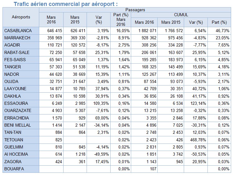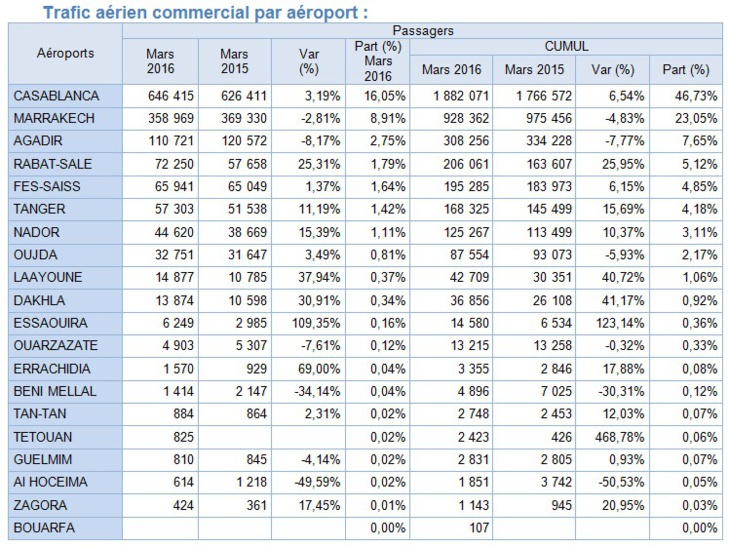 Les aéroports du Royaume ont enregistré, en mars 2016, un volume de trafic commercial de 1 435 414 passagers, soit une augmentation de +2,76% par rapport à la même période de l’année 2015. L’aéroport Mohammed V a enregistré 646 415 passagers (+3,19%), l’aéroport Rabat Salé a enregistré 72 250 passagers (+25,31%) et l’aéroport Tanger Ibn Battouta a enregistré 57 303 passagers (+11,19%).