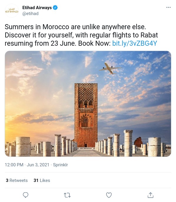 Etihad Airways d'Abu Dhabi a annoncé qu'elle reprendrait ses vols commerciaux directs vers Rabat au Maroc et Phuket en Thaïlande. Les vols à destination de Rabat reprendront le 23 juin 2021, les autorités d'Abu Dhabi ont récemment ajouté le Maroc à la liste verte de l'émirat, les passagers marocains entrants n'ont donc plus besoin de se mettre en quarantaine à leur arrivée dans la capitale des Émirats arabes unis.