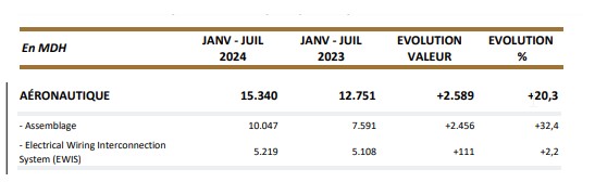 Pour les sept premiers mois de 2024, les exportations du secteur aéronautique marocain ont atteint 15.340 millions de dirhams, contre 12.751 millions de dirhams en 2023. L'Assemblage a généré 10.047 millions de dirhams, tandis que l'EWIS a contribué à hauteur de 5.219 millions de dirhams.
