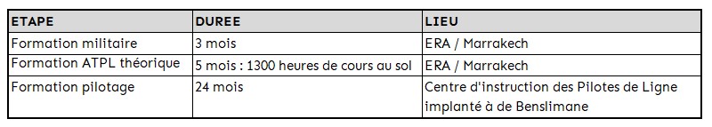 Les futurs pilotes de ligne seront instruits à l’ERA de Marrakech et dans les bases aériennes de Benguérir et Kénitra entre autres et seront intégrés à la fin de leur formation dans le corps de réserve en tant qu’officiers. Ce système mixte de formation des pilotes de ligne marocains existait au Maroc jusqu’à ce qu’il ne soit abandonné au milieu des années 1990. Le stage durait six mois.