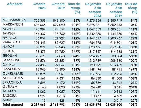 L'évolution concerne la majorité des aéroports qui ont connu de fortes hausses du trafic passagers par rapport à 2019 : Tétouan (+485%), Essaouira (+67%), Tanger (+44%), Nador (+35%), Oujda (+33%), Fès (+22%), Agadir (+11%).