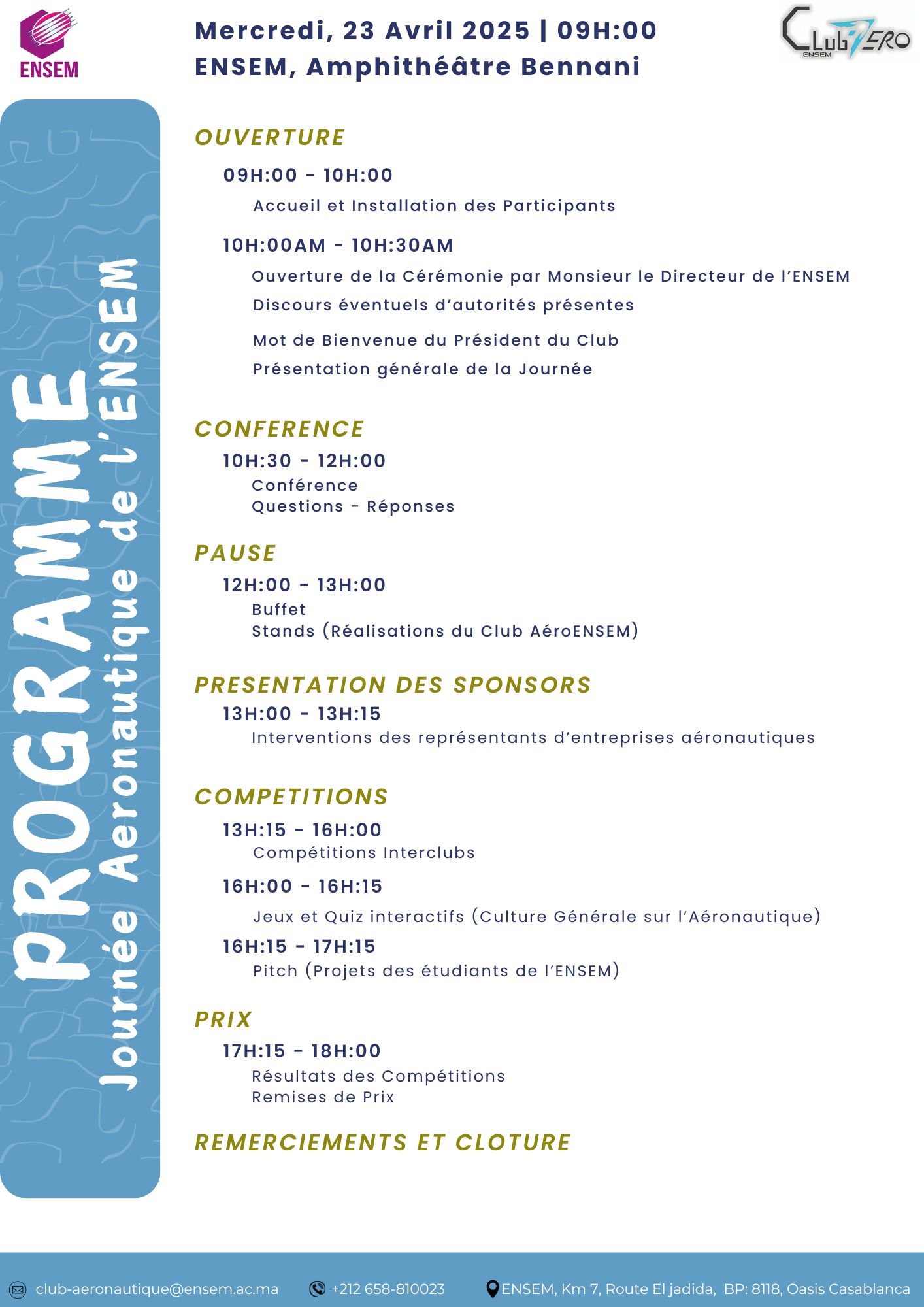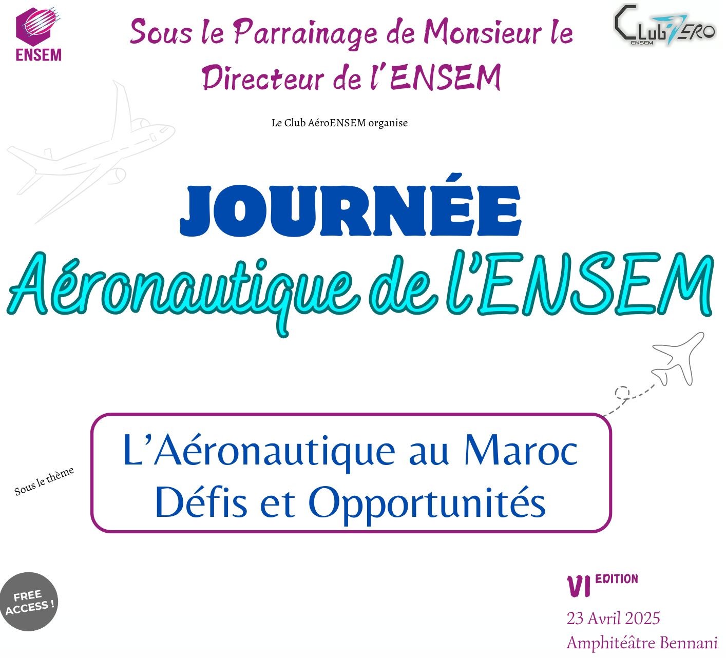 Le Club AéroENSEM organise la Journée Aéronautique de l'ENSEM, un événement majeur sous le parrainage du Directeur de l'École Nationale Supérieure d'Électricité et de Mécanique (ENSEM) de Casablanca. La sixième édition de cet événement est prévue pour le mercredi 23 avril 2025. Le thème retenu est «Aéronautique au Maroc : Défis et Opportunités», reflétant l'importance croissante du secteur aéronautique au Maroc, qui se positionne comme un hub stratégique pour l'industrie.