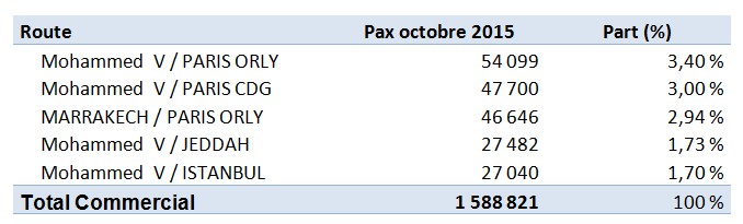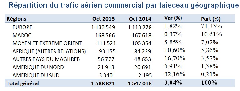 Les aéroports du Royaume ont enregistré, en octobre 2015, un volume de trafic commercial de 1 588 821 passagers, soit une nette augmentation de +3,04 % par rapport à la même période de l’année 2014. L’aéroport Fès Saiss a enregistré 81 284 passagers (+10,47%), l’aéroport Mohammed V a enregistré 715 339 passagers (+3,83%) et l’aéroport Agadir Al Massira a enregistré 137 474 passagers (+3,86%), marquant ainsi une rupture avec une tendance baissière qui a duré plusieurs mois pour cet aéroport.