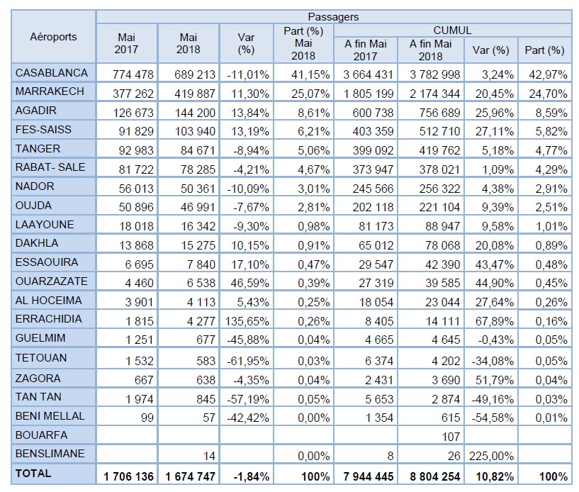 Les aéroports du Royaume ont enregistré en Mai 2018, un volume de trafic de 1 674 747 passagers contre 1 706 136 passagers accueillis en mai 2017, soit une baisse de -1,84% par rapport à la même période de l’année 2017. Cette baisse s’expliquerait par l’effet saisonnier du Ramadan.