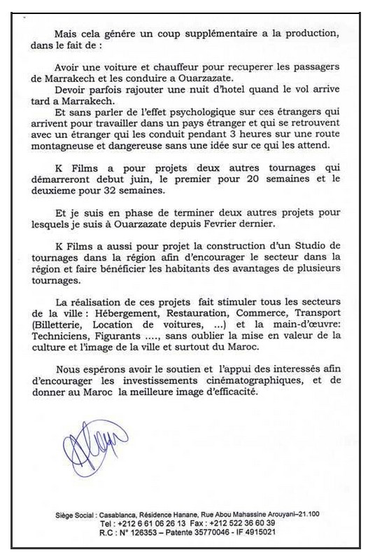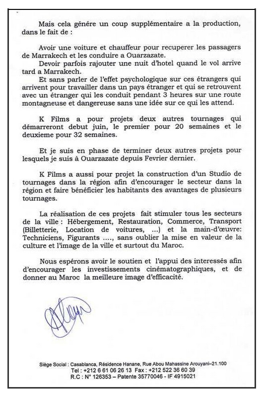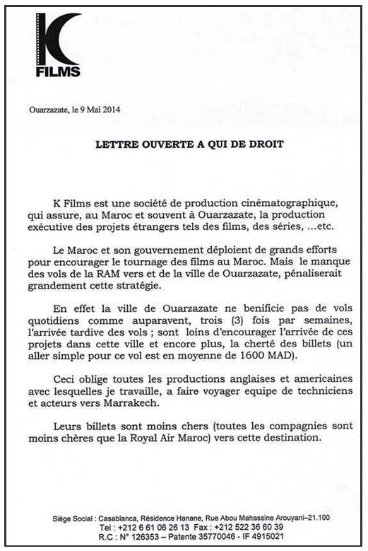 Le Maroc et son gouvernement déploient de grands efforts pour encourager le tournage des films au Maroc, mais le manque des vols de la RAM vers et de la ville de Ouarzazate pénaliserait grandement cette stratégie", lance dans une lettre adressée à qui de droit K Films, une société qui assure, souvent à Ouarzazate, la production des projets de films, séries...