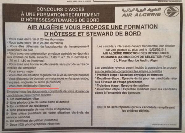 Donc, en plus d'avoir un physique agréable, savoir nager, mesurer au moins 160 cm, détenir un baccalauréat, Air Algérie exige, et uniquement pour les femmes, d’être célibataire.