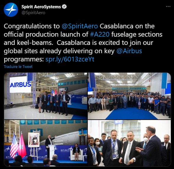 “Le Royaume fabrique déjà des pièces pour tous les avions commerciaux d'Airbus, y compris l'A220. Cet appareil est le dernier ajout à notre gamme de produits et par conséquent à notre empreinte industrielle au Maroc. Avec cette réalisation, la fabrication des pièces de l'A220 est désormais bien intégrée dans l'écosystème aéronautique marocain et peut fièrement être décrite comme "Made in Morroco". Aujourd'hui, nous célébrons une nouvelle étape importante dans notre relation avec le Maroc et Spirit AeroSystems et nous sommes impatients de continuer à construire ensemble une industrie aéronautique robuste et durable" a déclaré Mikail Houari, President, Airbus Afrique et Moyen Orient.