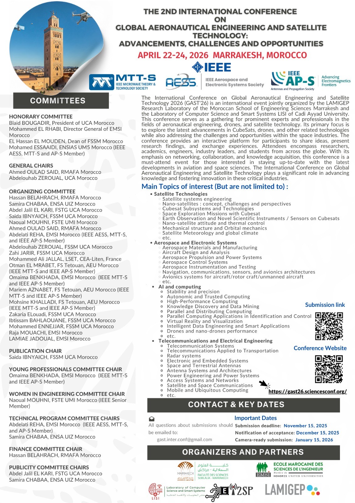 Cette rencontre, organisée conjointement par l’Université Cadi Ayyad de Marrakech via son laboratoire LISI (Laboratoire d'ingénierie des Systèmes informatiques) et l’École Marocaine des Sciences de l’Ingénieur (EMSI), avec le soutien technique des sociétés savantes IEEE-AESS, IEEE-APS et IEEE-MTTS, ambitionne de rassembler des experts, chercheurs, industriels et étudiants sur les avancées en génie aéronautique, technologies drones et solutions satellitaires.