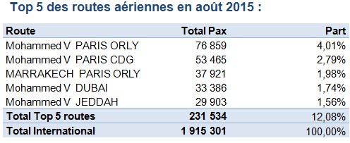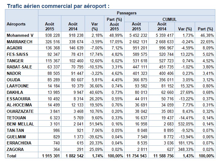 Durant le mois d’août 2015, les aéroports marocains ont enregistré 15 999 mouvements d’avions, soit une augmentation de +2,6% par rapport à la même période de l’année précédente. La part de l’aéroport Mohammed V est de 49,68% de ce trafic, l’aéroport Marrakech Ménara représente 15,29% et l’aéroport Agadir Al Massira 6,98%.