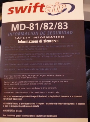 Il est évident que cette compagnie, Swiftair, réponds aux normes de sécurité et que son avion est sûr. Mais, allez expliquer cela à la centaine de passagers, de différents âges, alors qu'ils entendent sifflements et claquements tout au long du trajet, alors qu'ils voient les portes des soutes à bagages s'ouvrir toutes seules et alors qu'ils ne trouvent pas de poulet dans un plat...au poulet.