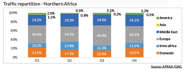 L'Afrique du Nord reste la partie la plus active en Afrique en termes de passagers, représentant 36,6 % du trafic continental total, suivie par l'Afrique de l'est. La majeure partie de ce trafic est dirigée hors du continent notamment vers l'Europe : 45% avant la pandémie. Le Moyen-Orient est également une destination privilégiée de l'Afrique du Nord (22% du trafic en 2019) en raison de la forte relation culturelle et économique entre le Maghreb et le Moyen-Orient.