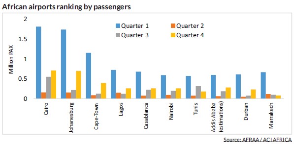 Johannesburg et Le Caire sont les aéroports les plus fréquentés d'Afrique. Après la forte baisse du trafic au 2ème trimestre, les aéroports du Caire, de Casablanca, d'Addis et de Nairobi ont vu leur trafic augmenter. Les aéroports sud-africains n'ont vu d'amélioration qu'à partir du dernier trimestre de l'année. Lagos et Marrakech ont en revanche connu une baisse du trafic au cours du troisième trimestre.