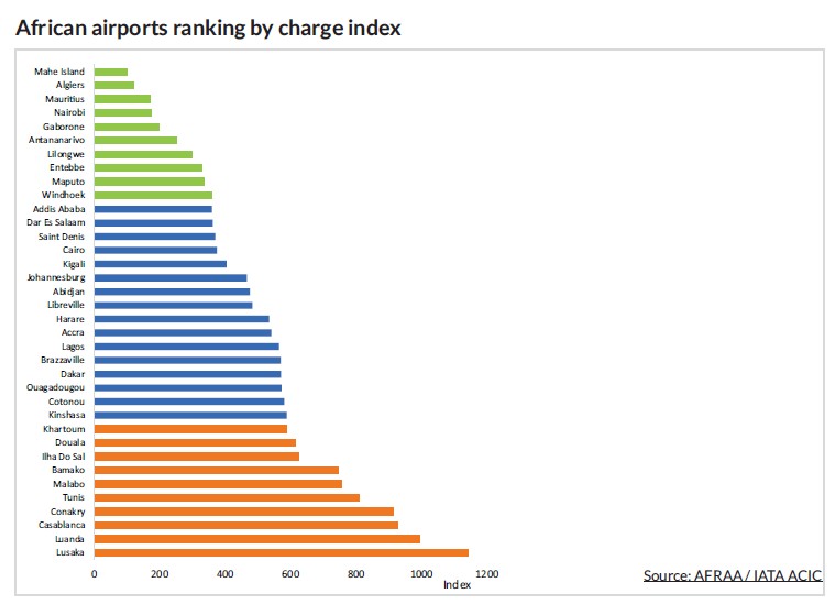 Lusaka a le niveau de redevances le plus élevé tandis que l'île de Mahé a le plus bas parmi les 36 aéroports sélectionnés. L'aéroport Mohammed V à Casablanca arrive en 3ème position après l'aéroport de Luanda. Certains des aéroports les plus fréquentés d'Afrique comme Johannesburg, Addis, Alger sont parmi les moins chers. Le rapport de l'AFRAA conclu que la baisse des redevances aéroportuaires peut avoir un effet positif sur le trafic.