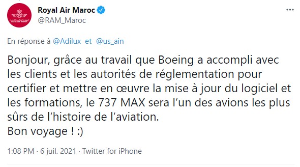 Royal Air Maroc a assuré dans Tweet que “le 737 MAX sera l’un des avions les plus sûrs de l’histoire de l’aviation”.