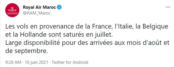 La compagnie nationale Royal Air Maroc a annoncé sur son compte Twitter que les vols en provenance de France, d’Italie, de Belgique et de Hollande sont saturés en juillet.