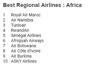 Royal Air Maroc a remporté à Paris, le prix de la meilleure compagnie aérienne régional en Afrique pour l’année 2017 décerné par Skytrax en marge du Salon International de l'Aéronautique et de l'Espace (SIAE) de Paris - Le Bourget. Royal Air Maroc a été classée en 6ème position au niveau de l'Afrique après Ethiopean Airlines, South African Airlines, Air Mauritius, Air Seychelles et Kenyan Airways.