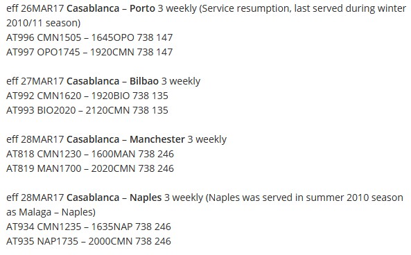 Royal Air Maroc vient d'annoncer le lancement en 2017 de quatre nouvelles liaisons depuis l'aéroport Mohammed V de Casablanca vers des villes européennes: Porto (Portugal), Naples (Italie), Bilbao (Espagne) et Manchester (Royaume-Uni). Les vols seront effectués en Boeing 737-800.