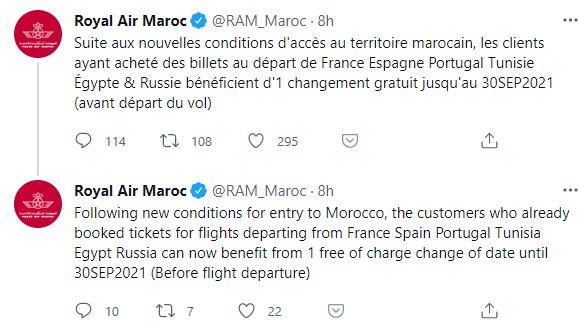 Suite aux nouvelles conditions d'accès au territoire marocain (passage de quelques pays de la liste A à la liste B), Royal Air Maroc a informé ses clients ayant acheté des billets au départ de la France, de l’Espagne, du Portugal, de la Tunisie, de l’Égypte et de la Russie, qu’ils peuvent bénéficier d’un changement gratuit, et ce jusqu'au 30 septembre 2021.