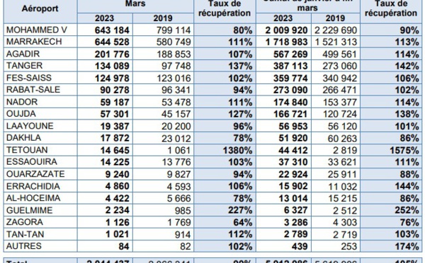 Les aéroports du Royaume ont enregistré, durant le premier trimestre 2023, un volume de trafic commercial de 5.912.986 passagers et de 46.313 mouvements aéroportuaires, soient une évolution du trafic passagers de 5% et un taux de...