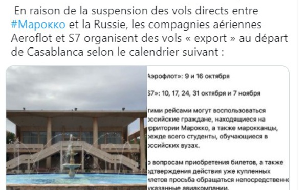 L'ambassade de Russie à Rabat a annoncé ce vendredi qu'elle allait expatriée ses citoyens du Maroc. La décision est prise trois jours après que le Maroc a interdit les vols en provenance et à destination de la Russie, après un pic de cas liés au...