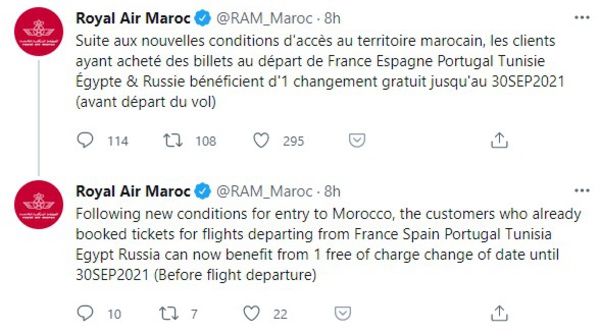 Suite aux nouvelles conditions d'accès au territoire marocain (passage de quelques pays de la liste A à la liste B), Royal Air Maroc a informé ses clients ayant acheté des billets au départ de la France, de l’Espagne, du Portugal, de la Tunisie, de...