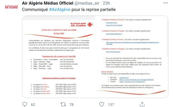 Suite à la décision des autorités algérienne relative à l'ouverture partielle des frontières aériennes, Air Algérie a annoncé samedi dans un communiqué son programme de vols et les tarifs des voyages. "Conformément aux décisions des autorités...