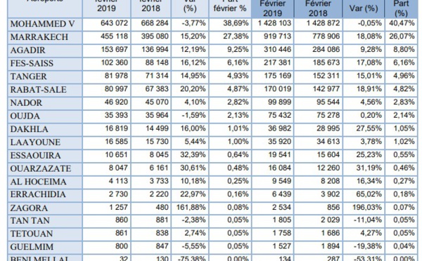 Les aéroports du Royaume ont enregistré en février 2019, un volume de trafic commercial de 1 662 296 passagers, soit une augmentation de +6,43% par rapport à la même période de l’année 2018. La plupart des aéroports ont enregistré des...
