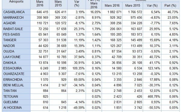 Les aéroports du Royaume ont enregistré, en mars 2016, un volume de trafic commercial de 1 435 414 passagers, soit une augmentation de +2,76% par rapport à la même période de l’année 2015. L’aéroport Mohammed V a enregistré 646 415 passagers...