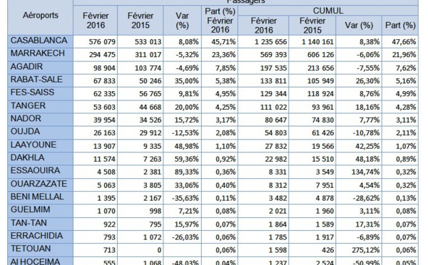Les aéroports du Royaume ont enregistré, en février 2016, un volume de trafic commercial de 1 260 338 passagers, soit une progression de +5,64% par rapport à la même période de l’année 2015. L’aéroport Mohammed V a...