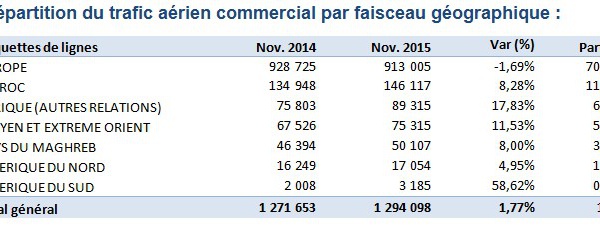 Les aéroports du Royaume ont enregistré, en novembre 2015, un volume de trafic commercial de 1 294 098 passagers, soit une augmentation de +1,77 % par rapport à la même période de l’année 2014. L’aéroport Mohammed V a enregistré 589 708 passagers...