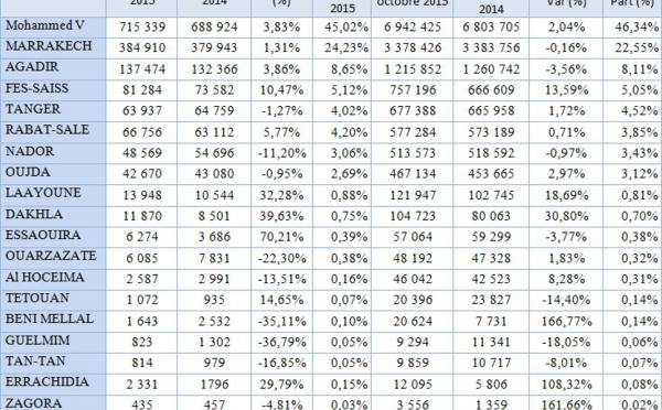 Les aéroports du Royaume ont enregistré, en octobre 2015, un volume de trafic commercial de 1 588 821 passagers, soit une nette augmentation de +3,04 % par rapport à la même période de l’année 2014. L’aéroport Fès Saiss a enregistré 81 284 passagers...