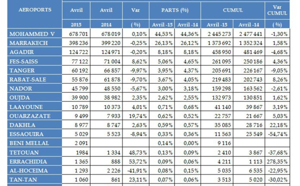 Les aéroports du Royaume ont enregistré, en avril 2015, un volume de trafic commercial de 1 524 242 passagers, soit une légère baisse de -0.27% par rapport à la même période de l’année 2014. L’aéroport Mohammed V a enregistré 678 701 passagers...