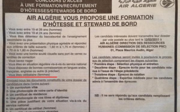 Une annonce d'Air Algérie pour la formation et le recrutement d'hôtesse de l'air et de steward a suscité l’intérêt des réseaux sociaux. Désormais, pour qu'une femme devienne hôtesse à Air Algérie, elle doit d'abord être... célibataire. Donc, en...