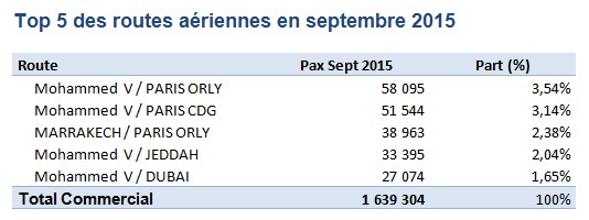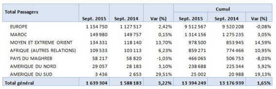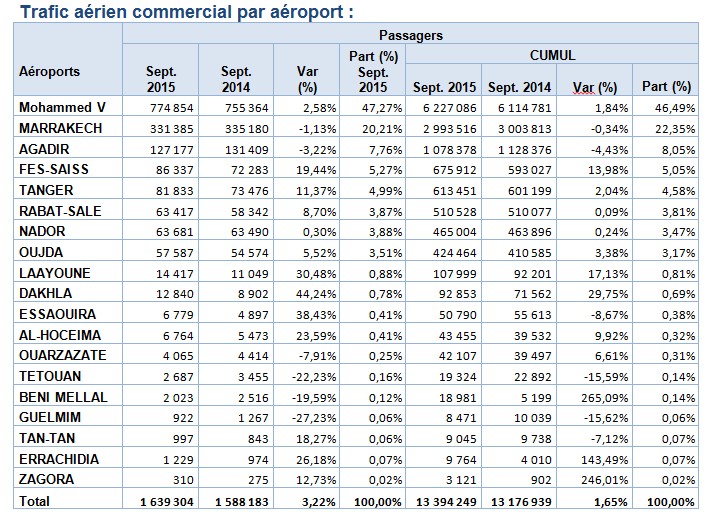 Les aéroports du Royaume ont enregistré, en septembre 2015, un volume de trafic commercial de 1 639 304 passagers, soit une nette augmentation de +3,22% par rapport à la même période de l’année 2014. L’aéroport Fès Sais a enregistré 86 337 passagers (+19,44%), l’aéroport Tanger Ibn Battouta a enregistré 81 833 passagers (+11,37%) et l’aéroport Rabat Salé a enregistré 63 417 passagers (+8,70%).
